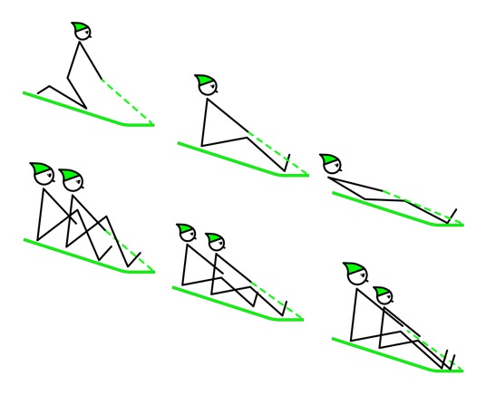 Steering Bobskis sledges requires some skill but can be soon mastered. Touch the snow on the side you wish to turn, as shown. At speed course correction is more effective if you pull back on the rope to lift the nose upwards. You can see this in action by clicking on the video link above. Shifting weight also helps to steer.